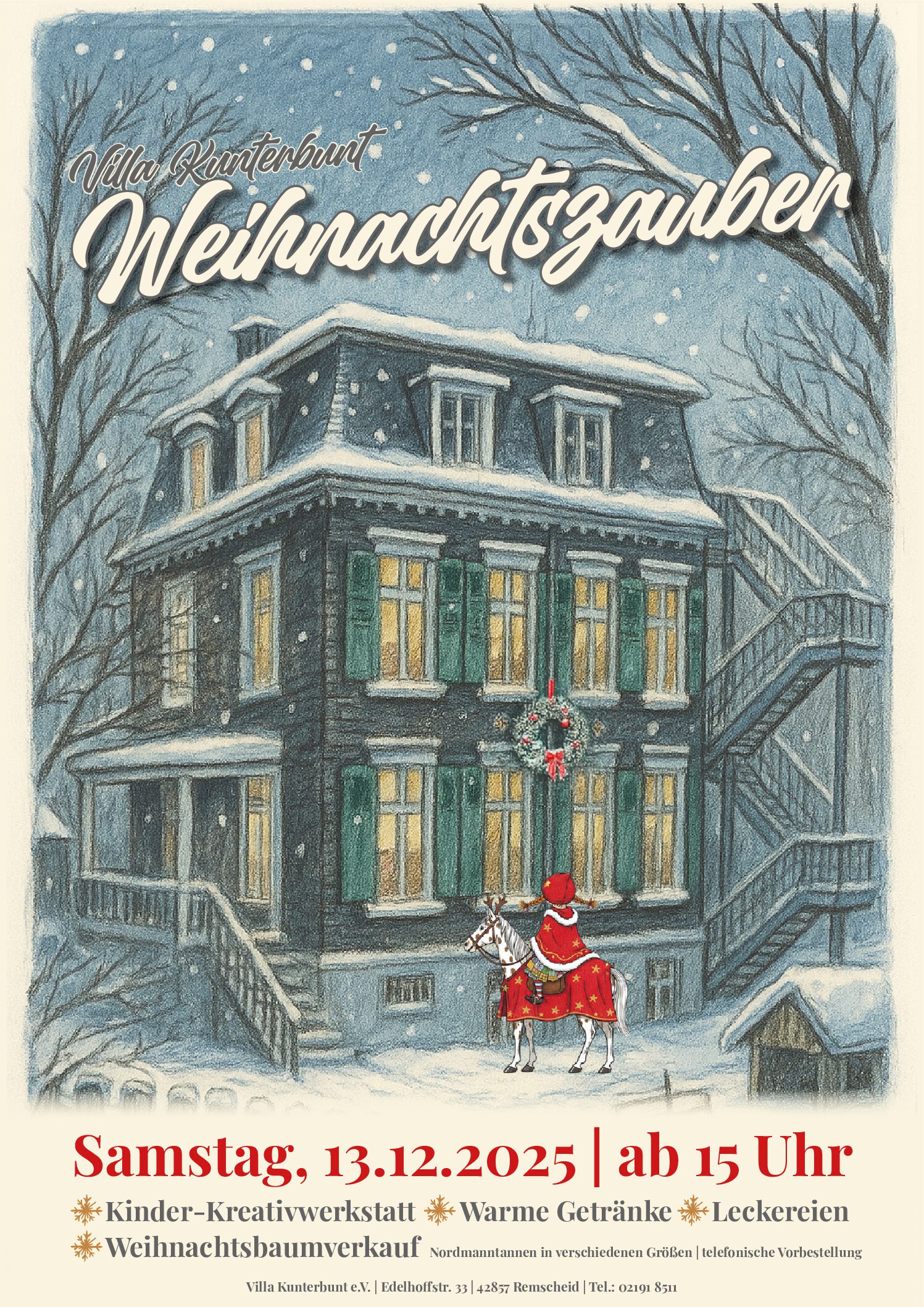 Familienzentrum Villa Kunterbunt e.V. Edelhoffstraße 33, RemscheidLiebe Eltern, Liebe Verwandte, Liebe Freunde und Förderer der Villa Kunterbunt, Wir wollen dieses Jahr wieder unseren Weihnachtszauber/ Baumverkauf veranstalten, wie Ihn einige von Ihnen aus der Vergangenheit kennen. Da wir die Weihnachtsbäume aber bereits bestellen müssen, wollte ich einmal nachfragen, wer von Ihnen seinen Weihnachtsbaum über die Villa Kunterbunt beziehen möchte und wenn ja [...]